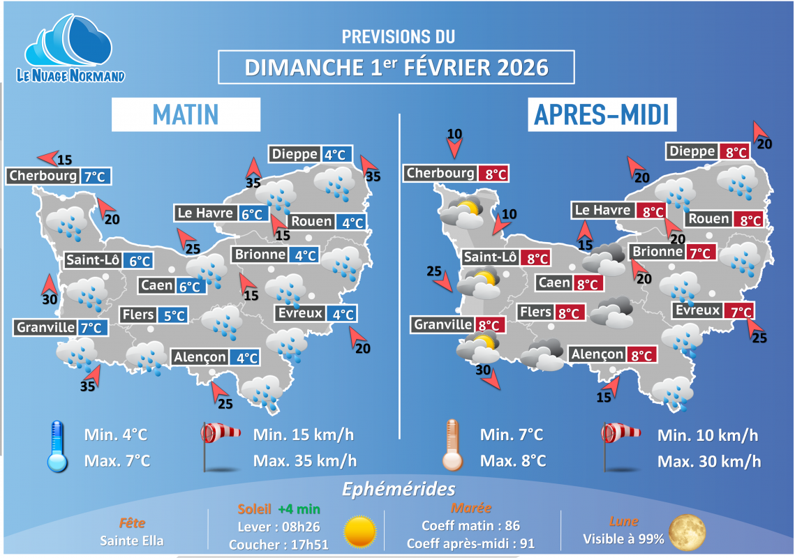 Demain matin, une nouvelle perturbation arrivera en fin de nuit par le département de la Manche avant d’envahir la région d’ici la fin de la matinée, apportant des pluies généralement faibles. Le vent sera faible et de direction variable, avec des rafales comprises entre 15 et 35 km/h. Les températures minimales se situeront entre 4 et 7 °C.