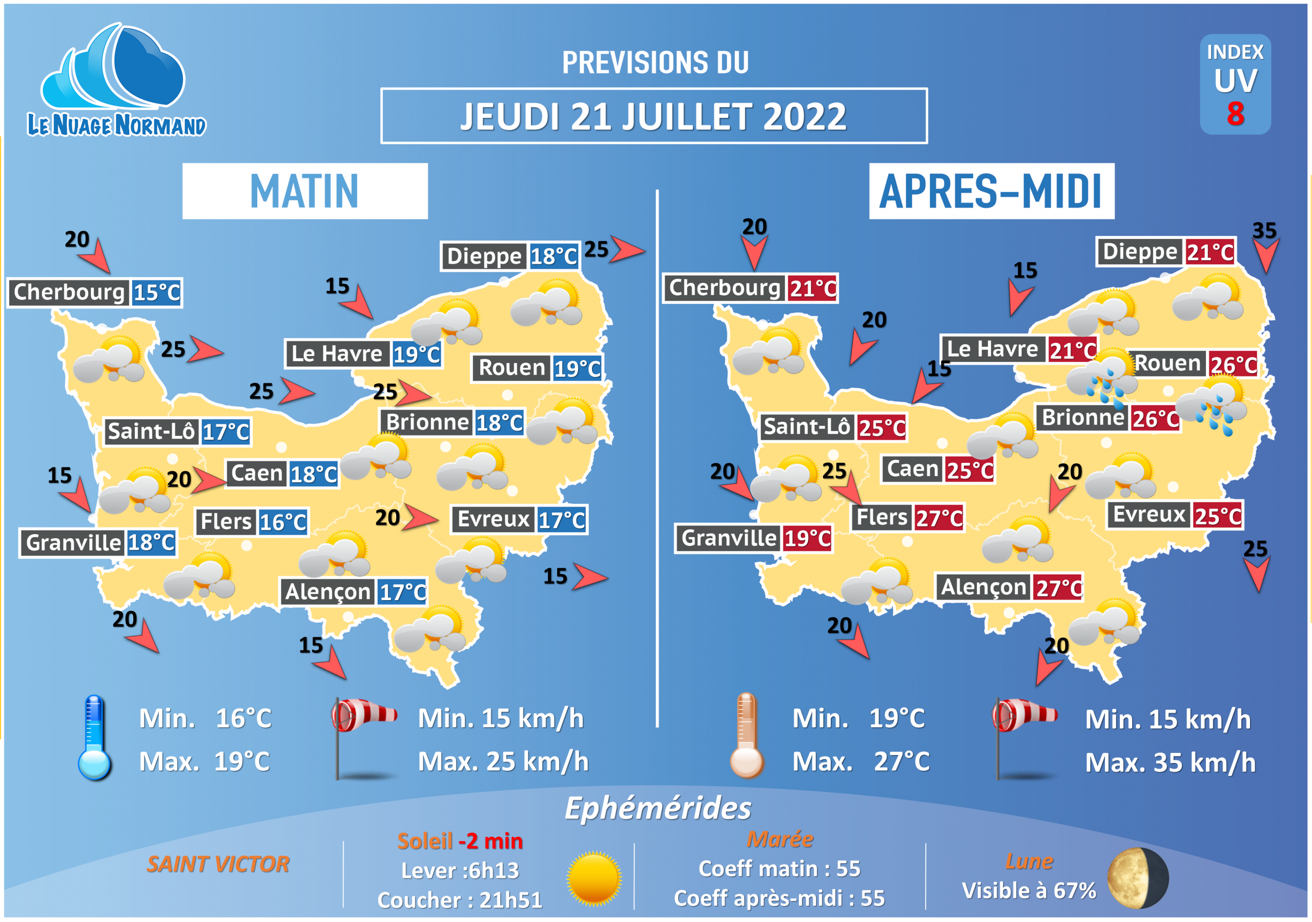Pour votre journée de jeudi, alternance de nuages et d’éclaircies du matin au soir avec la possibilité de quelques averses très localement sur les secteurs de Rouen dans le courant de l’après-midi.