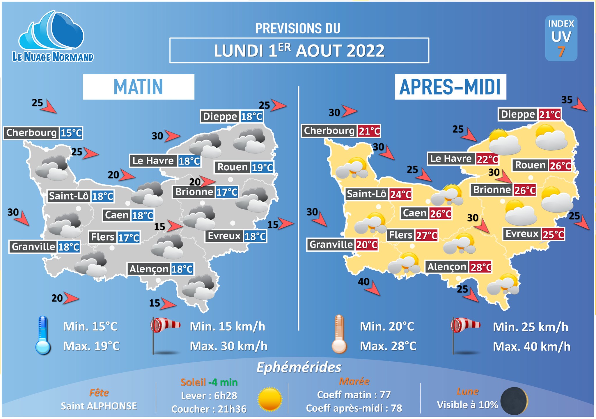 Le vent basculera au Nord-Ouest avec des rafales de l’ordre de 25 à 40 km/h.