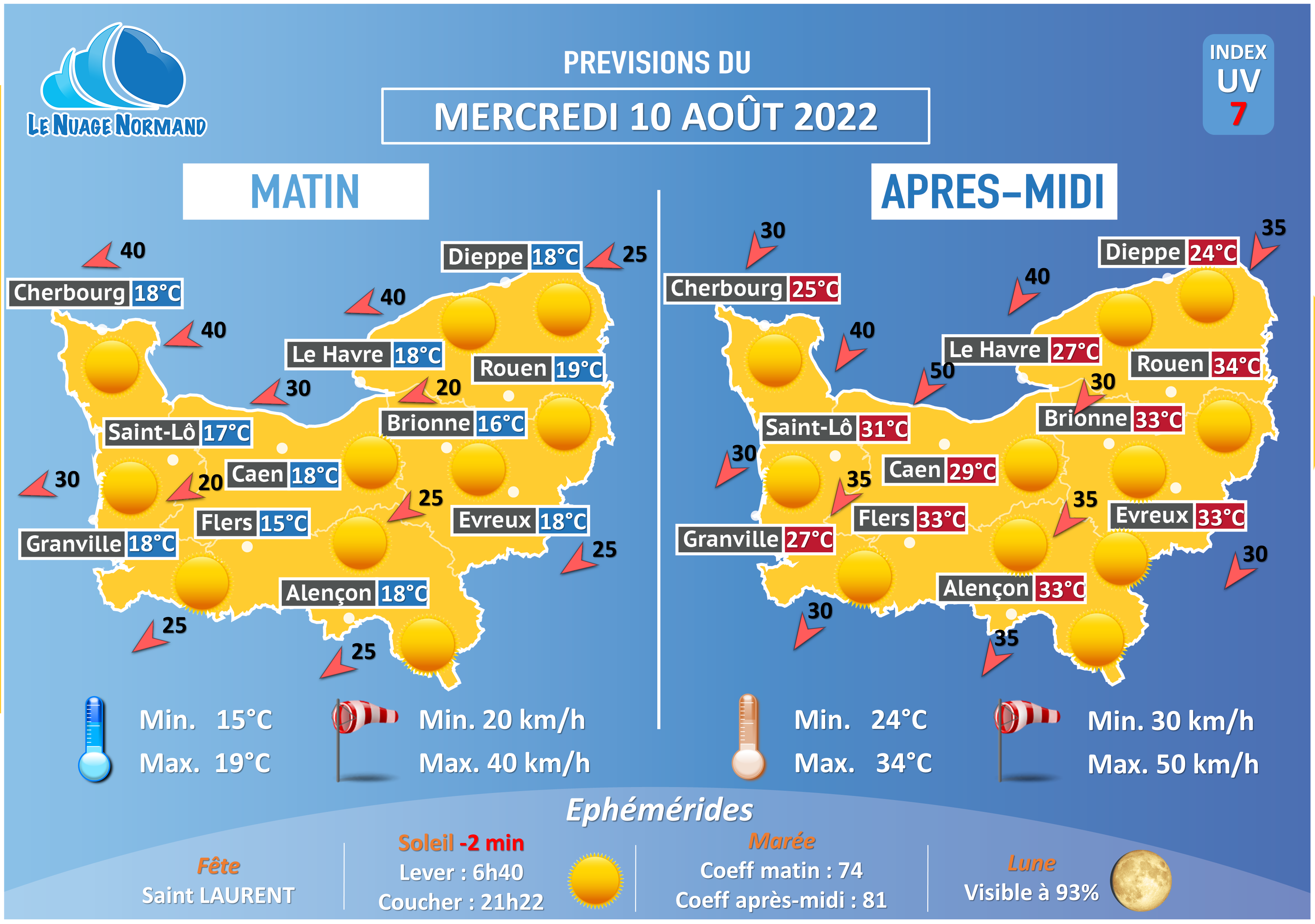 Les températures maximales vont s’envoler, il fera de 24°C à 27°C le long des côtes et de 29°C à 33°C dans les terres, localement 34°C l’agglomération Rouennaise.