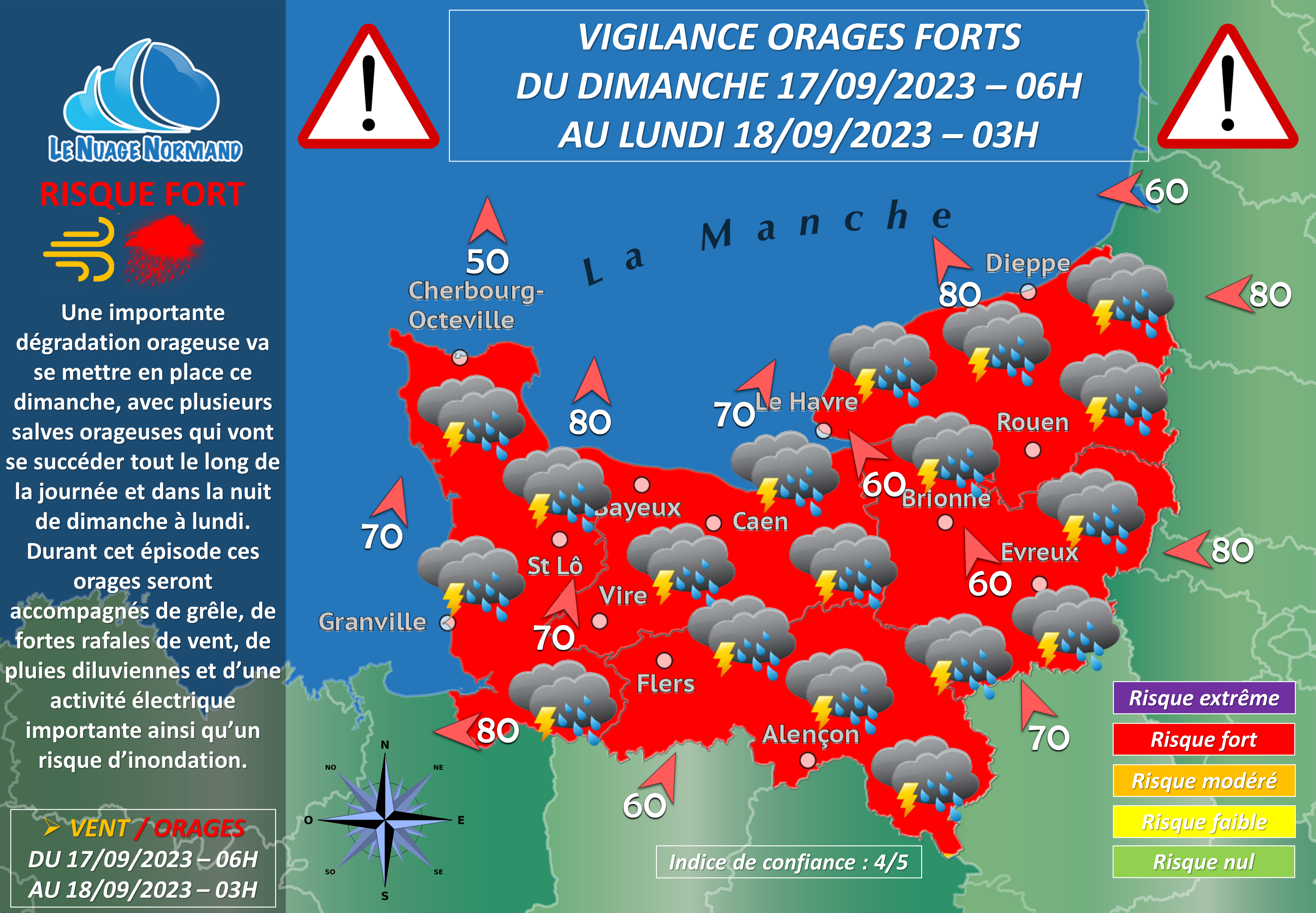 Un temps fortement orageux se profile pour la journée de dimanche et en première partie de nuit lundi. En effet 3 salves orageuses vont se succéder dès ce dimanche matin. La première arrivera par le sud Manche aux alentours de 06h00 et remontée ensuite sur le Calvados. La seconde, abordera le sud de l’Eure en début d’après-midi, tout en progressant vers la Seine-Maritime. Une accalmie se dessine en milieu d’après-midi avant l’arrivée de la troisième salve en soirée aux alentours de 19h00 sur le département de la Manche, puis sur le reste de la région en cours de soirée et durant la nuit.